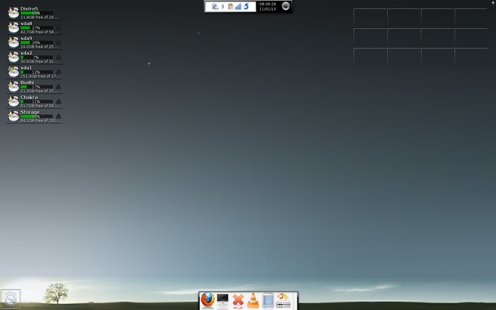 You will notice that I use many Gnome/GTK tool sets in place of some of the default E17 ones, this is because I feel they do a better job of accomplishing their given task. I did this because while E17 is wonderfully pretty, I want the desktop to be as usable as possible. PCManFM is the default file manager, Shutter is included to take screen-shots, and parcellite is included as a light-weight clipboard manager. This release also includes non-free software such as Adobe Flash, Sun Java, multi-media codecs, and Skype (if there is an interest I will compile a version of the DVD excluding all non-free components).